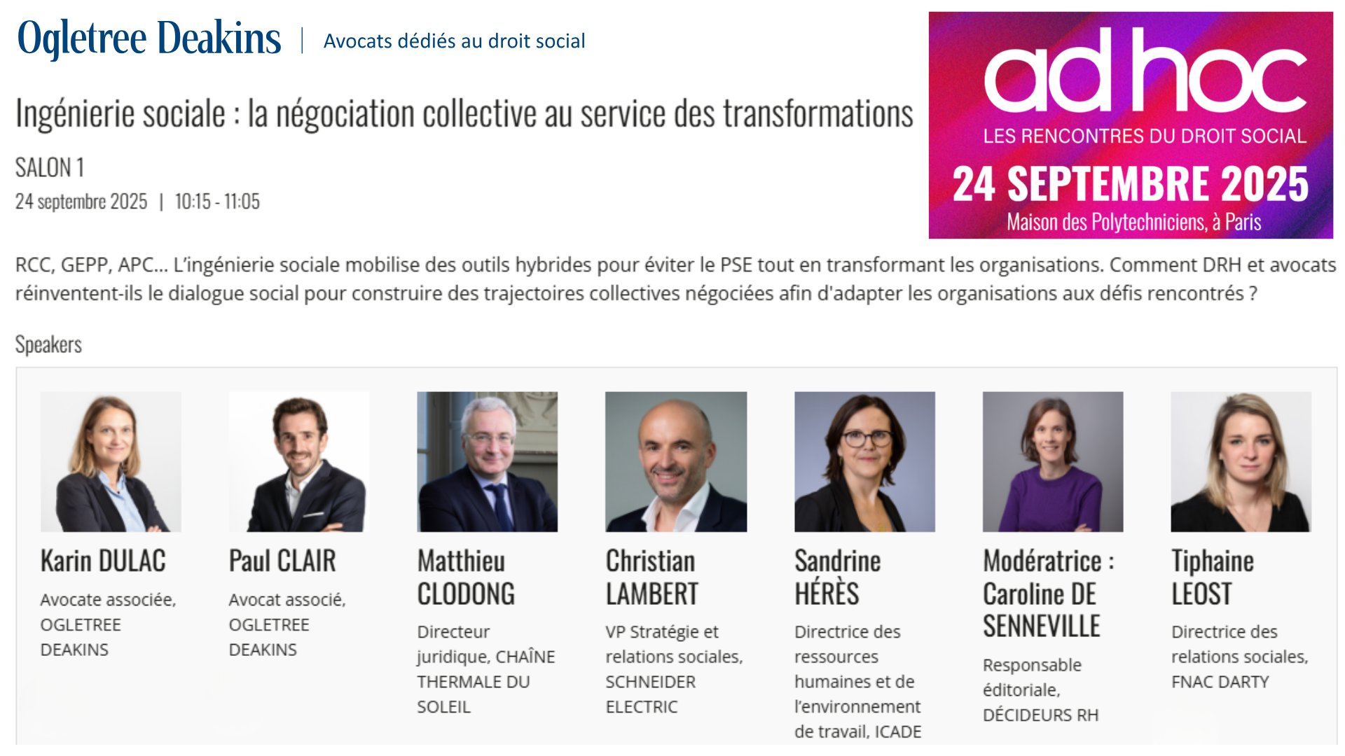 💡𝗘𝗩𝗘𝗡𝗘𝗠𝗘𝗡𝗧 | Les entreprises disposent aujourd’hui d’outils nouveaux pour adapter leurs organisations autrement que par le PSE.RCC, GEPP, APC… ces dispositifs redessinent le terrain du dialogue social et ouvrent la voie à des trajectoires collectives négociées.➡️ Quels usages concrets de ces mécanismes hybrides ?➡️ Quelles conditions de réussite pour instaurer la confiance et sécuriser les transformations ?➡️ Quel rôle pour les DRH et leurs conseils dans cette dynamique ?Nos avocats associés Karin Dulac et Paul CLAIR partageront leur expertise aux côtés de :- Sandrine HERES, Membre du Comex en charge des RH et de l’environnement de travail – Icade- Tiphaine LEOST, Directrice des relations sociales – Groupe Fnac Darty- Matthieu CLODONG, Directeur juridique – Chaîne Thermale du Soleil- Christian Lambert, VP Stratégie et relations sociales – Schneider ElectricModération : Caroline de Senneville, Responsable éditoriale – DÉCIDEURS RHUn temps fort pour croiser regards juridiques et pratiques de terrain, et explorer comment l’ingénierie sociale peut devenir un levier stratégique pour l’entreprise.📅 24 septembre 2025 | 10h15 – 11h05 | ad hoc – Les Rencontres du Droit social – Hôtel de Poulpry • Maison des Polytechniciens à ParisSalon 1 – Table-ronde : Ingénierie sociale : la négociation collective au service des transformationsInfos : communicationfr@ogletree.com