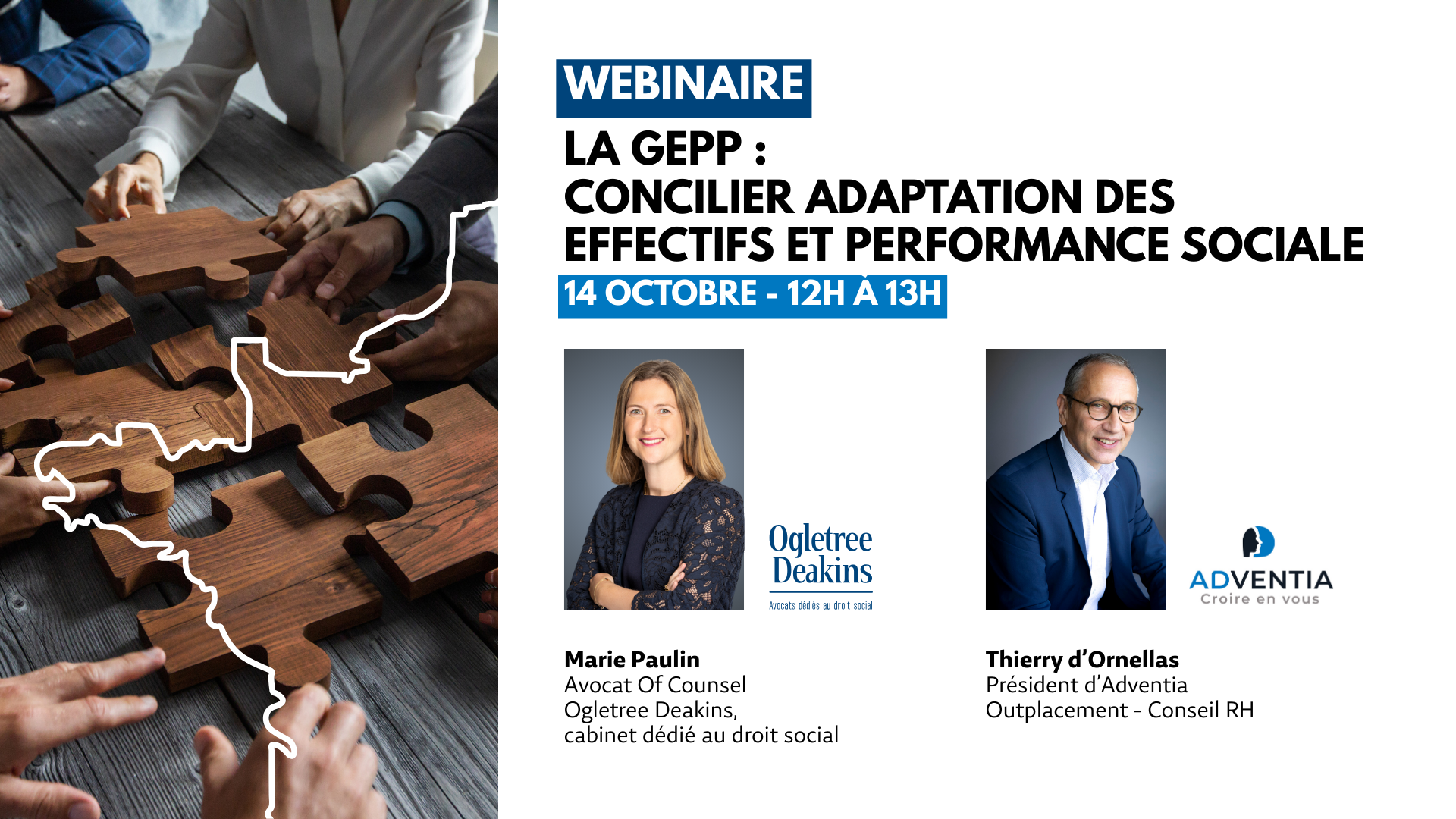 📍𝗪𝗘𝗕𝗜𝗡𝗔𝗜𝗥𝗘 | 𝗗𝗲𝗽𝘂𝗶𝘀 𝗡𝗮𝗻𝘁𝗲𝘀, 𝗮𝘂 𝘀𝗲𝗿𝘃𝗶𝗰𝗲 𝗱𝗲𝘀 𝗲𝗻𝘁𝗿𝗲𝗽𝗿𝗶𝘀𝗲𝘀 𝗿𝗲́𝗴𝗶𝗼𝗻𝗮𝗹𝗲𝘀Réorganiser les effectifs, accompagner les trajectoires professionnelles, installer la confiance : la GEPP est un outil clé pour concilier performance sociale et adaptation des organisations.Ogletree Deakins, cabinet dédié au droit social, et Adventia (outplacement, conseil RH) proposent une approche complémentaire mêlant expertise juridique et RH, et vous donnent rendez-vous depuis Nantes pour un webinaire dédié aux acteurs RH, juridiques et sociaux de la région Ouest.« 𝗟𝗮 𝗚𝗘𝗣𝗣 : 𝗰𝗼𝗻𝗰𝗶𝗹𝗶𝗲𝗿 𝗮𝗱𝗮𝗽𝘁𝗮𝘁𝗶𝗼𝗻 𝗱𝗲𝘀 𝗲𝗳𝗳𝗲𝗰𝘁𝗶𝗳𝘀 𝗲𝘁 𝗽𝗲𝗿𝗳𝗼𝗿𝗺𝗮𝗻𝗰𝗲 𝘀𝗼𝗰𝗶𝗮𝗹𝗲 »Intervenants :Marie Paulin (Millet-Taunay), Avocat Of Counsel – Ogletree Deakins (Nantes)Thierry d’Ornellas, Président d’Adventia (Nantes)Au programme : 𝗼𝘂𝘁𝗶𝗹𝘀 𝗰𝗼𝗻𝗰𝗿𝗲𝘁𝘀, 𝗿𝗲𝘁𝗼𝘂𝗿𝘀 𝗱’𝗲𝘅𝗽𝗲́𝗿𝗶𝗲𝗻𝗰𝗲 𝗲𝘁 𝗯𝗼𝗻𝗻𝗲𝘀 𝗽𝗿𝗮𝘁𝗶𝗾𝘂𝗲𝘀 pour faire de la GEPP un levier stratégique.